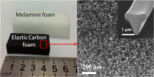 该碳泡沫除了具有优异的弹性外,同时还具有孔隙率高、密度低、导电性好,比表面积大等优点,因此可大规模用于作为柔性储能器件的电极材料。