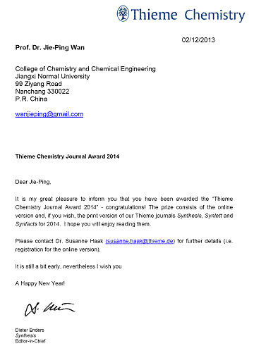 近日,学院万结平老师收到来自的Thieme出版集团通知,被授予该出版社2014年度Thieme化学期刊奖(Thieme Chemistry Journal Award 2014)荣誉称号。该奖由Thieme数据库三大著名有机化学期刊Synthesis, Synlett和Synfact编委会在全球范围遴选,授予在有机化学研究领域取得出色成果的青年科学家,全球每年约40人能获此荣誉。