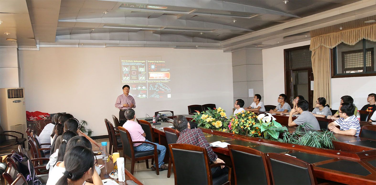 报告中,郭忠武教授给学院师生介绍了GPI锚及GPI锚定蛋白的化学和化学酶法合成及应用研究。他主要讲述了自己科研团队研发的关于GPI锚及GPI锚定蛋白合成的一些独特而有优势的合成方法,及利用化学酶合成法有效的将GPI锚和蛋白结合在一起,高效选择性得到一系列的GPI锚定蛋白化合物,这样一个开展生物化学,致病机理的研究方法,并在互动环节中细心解答了师生们的提问。(文/万常峰 图/黄志刚)