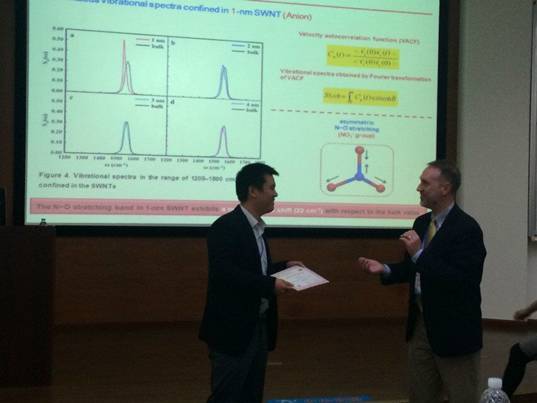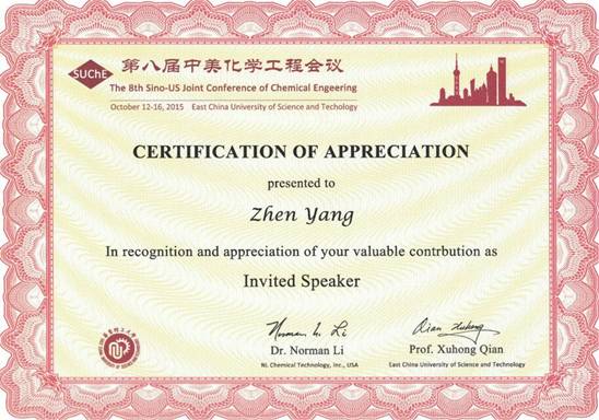 受大会组委会邀请,我院杨振老师参加了10月13日至16日在上海举行的第8届中美化学工程学术会议并做了题为“Anomalous Structures and Vibrational Spectra of Ethylammonium Nitrate Ionic Liquids in 1-nm Hydrophobic Nanochannel”邀请报告,将自己的研究工作和国内外专家进行了深入的探讨。