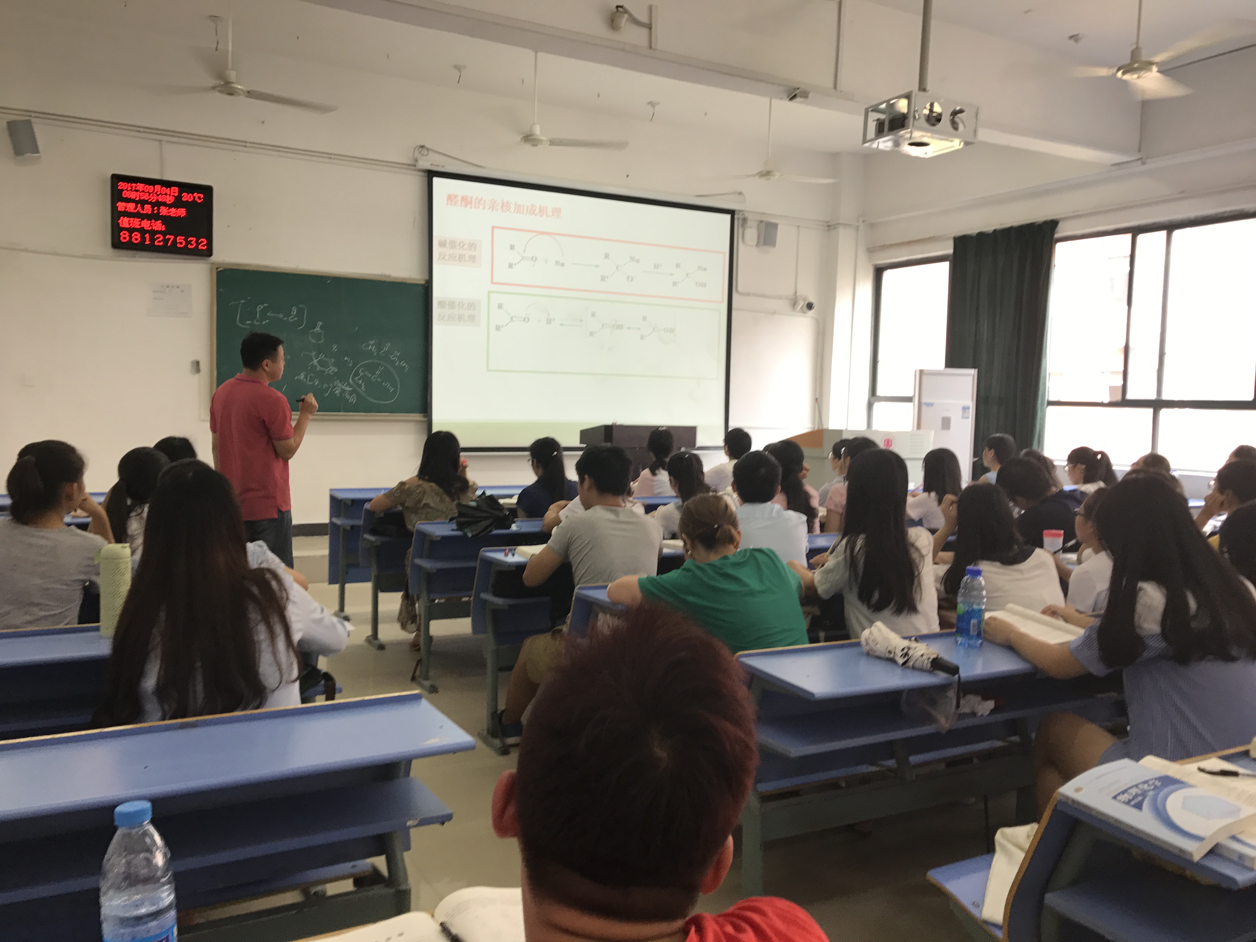 上午9时许,院党委副书记熊琍琍在化院辅导员陪同下检查了其他教室的上课情况。从检查情况来看,教师准备充分,学生按时到课,听课认真仔细,教学设备运行正常,我院开学第一天的教学运行平稳、正常。