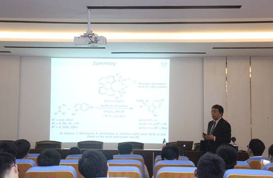 报告会上,Ishihara教授详细介绍了他课题组基于酸碱组合策略来设计高活性催化剂的方面的研究工作,其中包括手性布朗斯特酸催化的烯烃与亚胺的不对称加成环化串联反应,手性联萘膦酰胺催化的不对称多烯卤环化反应以及手性联萘磺酸催化的亚胺和吲哚的不对称付克反应。这些高活性的手性催化剂的设计合成在各类不对称反应中均有着的高效应用。报告尾声,Ishihara教授还介绍了日本名古屋大学的校园风光与名古屋大学研究生招生情况。会后,Ishihara教授与参会师生就相关学术问题进行了深入的讨论。