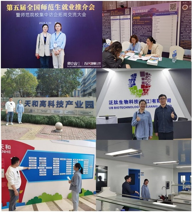 为深入学习贯彻党的二十大精神,认真落实学校关于2024届毕业生高质量就业“百日攻坚行动”的决策部署,推进我院毕业生高质量就业,3月30日至31日,院团委书记、2024届毕业班辅导员邹昀芹赴杭州参加全国第五届师范生就业推介会暨师范院校集中访企拓岗交流大会、并前往天和高科技产业园走访调研。邹昀芹老师通过推介会,为学生收集了师范类就业岗位200余个,并在现场帮学生投递简历30余份。 在天和高科技产业园,邹昀芹老师深入了解企业发展状况、用人需求,并参观了泛钛生物科技(浙江)有限公司等企业。