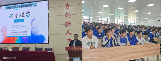 同时,江西省化学化工学会科普进校园——《化学与生活》讲座在中阳一中举行。在讲座中,宋永海教授以生动的语言和丰富的实际案例,向学生们讲解了化学科学知识的趣味性和实际应用。从生活中的科学现象到化学技术的应用,他深入浅出地为学生们展示了化学的无穷魅力。学生们听得津津有味,积极参与互动,整个讲座气氛热烈,学生们纷纷表示受益匪浅。