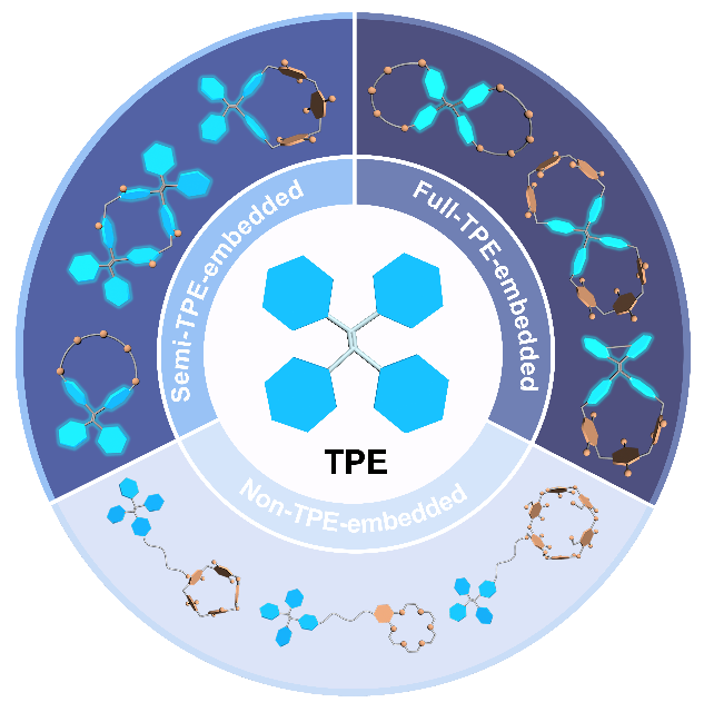 传统超分子大环主体分子虽在超分子化学领域具有广泛的应用基础,但其结构多样性有限、光物理性能相对不足,且普遍缺乏有效的发光特性,因而限制了其在功能材料领域的进一步拓展。通过“四苯乙烯(TPE)嵌入式”正交设计策略,将TPE单元整合至五代经典超分子大环骨架中,不仅保留了原有大环分子的主客体识别能力,还成功引入了AIE效应及一系列新颖的光物理行为,实现了结构多样化、多功能集成以及应用范围的显著拓展。本文基于团队相关研究积累并结合广泛的文献分析,从分子设计原理、光物理性质调控和应用研究探索三个方面系统综述了三类TPE嵌入式大环分子的研究进展,深入阐明了其结构设计—光物理性能—功能应用之间的内在关联机制,旨在为构建兼具主客体识别能力与聚集诱导发光特性的新型TPE嵌入式大环主体分子提供理论依据与实践指导,进一步推动基于TPE的超分子荧光大环在结构创新与实际应用中的发展潜能。