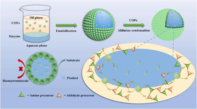 针对上述难题,该团队提出了一种简单而有效的策略,通过基于Pickering乳液制备原理的水-油界面组装和再生长方法,将酶有效地封装在稳定的COFs微胶囊内。根据特定的要求,可以合成具有高结晶度和不同官能团的微疏水COFs颗粒,将酶和微疏水COFs颗粒分别分散在接近生理环境的水相和油相中,然后通过高速剪切形成Pickering乳液并使其稳定,最后,通过添加COFs前驱体引发界面反应,增强微胶囊的壳层,并提出了可以精确预测和控制酶@MCCOFs尺寸的公示。水-油相的分离和温和的界面组装过程使得酶能被有效地包封而不被破坏。此外,在界面处组装和重新生长的坚固的COFs壳有效地保护了包封酶的结构,COFs壳规则的孔径能有效改善底物的运输,并且酶构象可以在大空腔中进行自由延伸。
