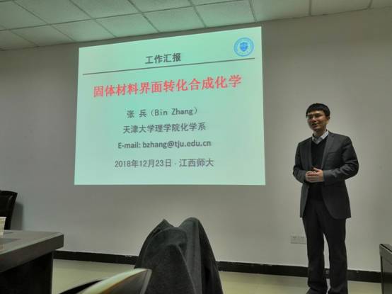 2018年12月23日下午,我院优秀研究生校友,青年拔尖人才,国家优秀青年基金获得者,天津大学张兵教授应邀回校进行学术交流,在方荫楼5510会议室作了题为“固体材料界面转化合成化学”的学术报告。化学化工学院、物理与通信电子学院、先进材料研究院等五十余位师生参加了报告会。