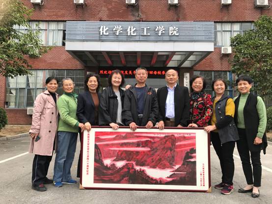 正值我校80周年校庆来临之际,2019年10月25日上午,化学系76级校友吴冬英一行9人,代表全班同学向学院捐赠《祖国山河一片红》国画,祝愿祖国繁荣昌盛,祝愿学校越办越好。学院原党委书记熊琍琍受邀参加。