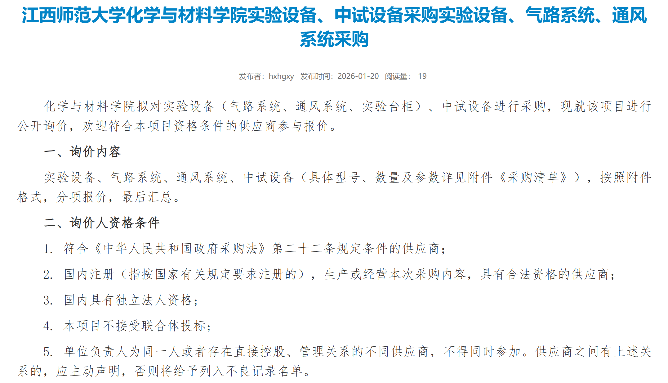 1月20日询价公告 江西师范大学化学与材料学院实...