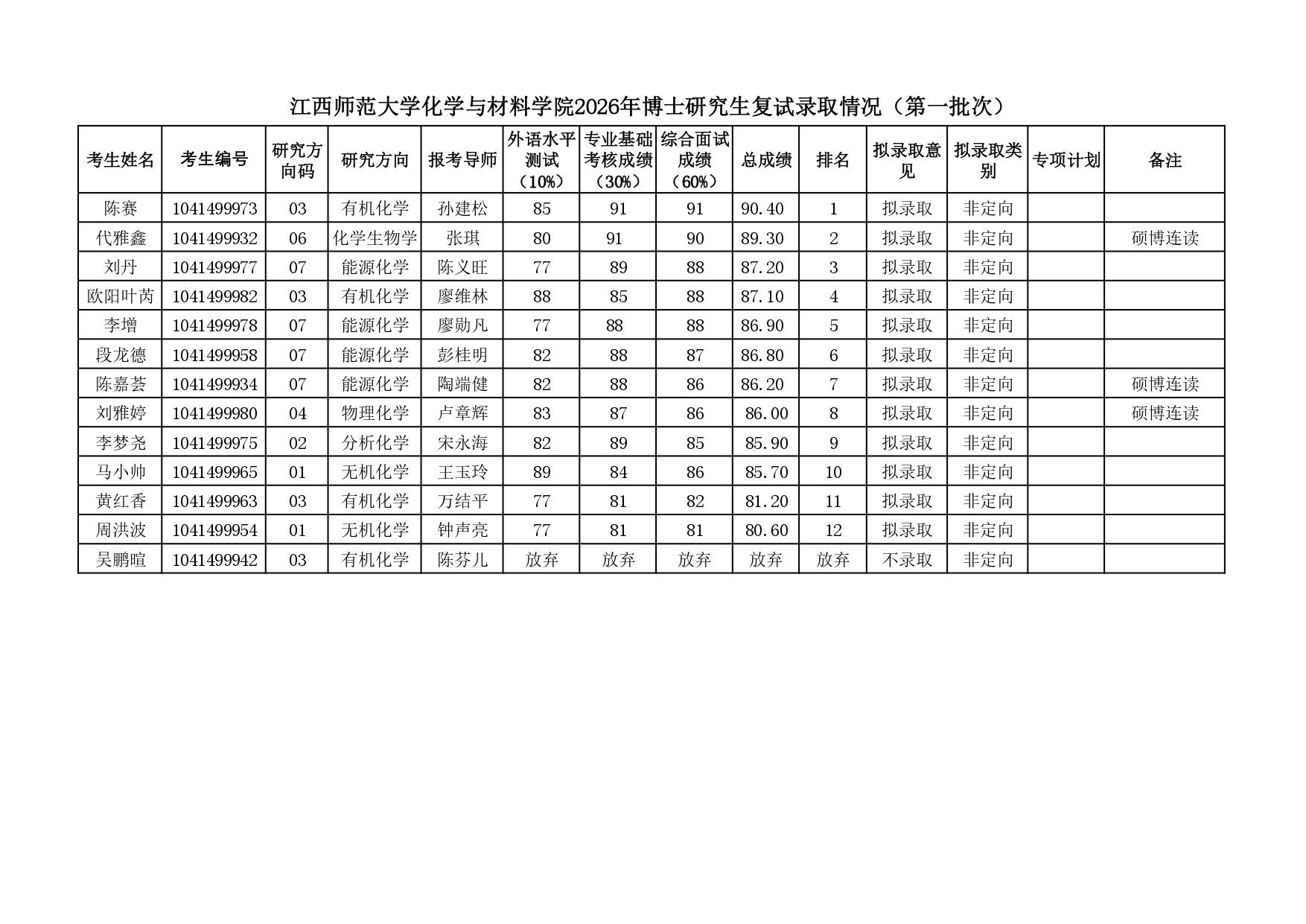化学与材料学院2026年博士研究生复试录取情况公...
