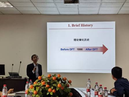 报告会上,胡教授向大家介绍了密度泛函计算在多相催化中的重要进展,他指出由于多相催化体系结构和反应的复杂性,仅用实验手段很难得到其化学过程的原子尺度图像和理解。通过密度泛函计算,催化反应机理能被有效确定,从而获得这些反应在原子尺度上的图像和原理,对催化学科做出了很大贡献。胡教授深入浅出地介绍了多相理论催化简史,多相催化“活性”的物理内涵和数学表示,及多相催化剂理性设计的最新进展和未来发展趋势。会后胡教授与参会师生进行了热烈的讨论,详细解答了师生的提问。