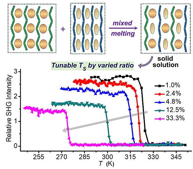 该团队研究人员通过调控有机铵阳离子的结构,构筑出两种结构相似的可熔化配位聚合物(i-PrNHMe2)[Cd(SCN)3] (1)和(MeNHEt2)[Cd(SCN)3](2)。其中化合物1表现出高信噪比的倍频效应“开/关”功能而2没有倍频效应。基于这二者特点,他们利用协同的双组分置换固溶化方法,将1和2进行熔融退火处理得到系列分子基固溶体{11–x2x}。变温倍频测试表明,仅仅通过改变两种化合物的组成比例,就可以获得“开/关”温度在273-328 K范围内可调的分子基固溶体。