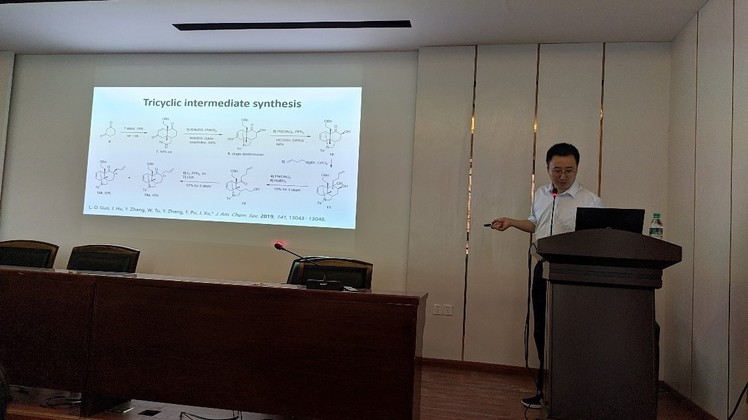 在报告会上,徐晶教授作了题为“复杂笼状天然产物的全合成”的学术报告,他从笼状天然产物的特点和在新药研发中的应用意义为我们展开介绍。徐教授从合成化学的角度,详细介绍了笼状天然产物的环系骨架、连续的手性中心和密集取代的原子。针对该类分子的骨架构筑、合成中的化学、区域和立体选择性控制等方面,徐教授介绍了该类化合物的机遇与挑战。该课题组近五年来重点关注复杂笼状天然产物的高效全合成研究,汇报近几年该课题组的一些代表性研究工作,如一些虎皮楠生物碱、二萜和二倍半萜的全合成工作。徐晶教授作完报告后,与参会师生就相关学术问题进行了热烈的讨论。