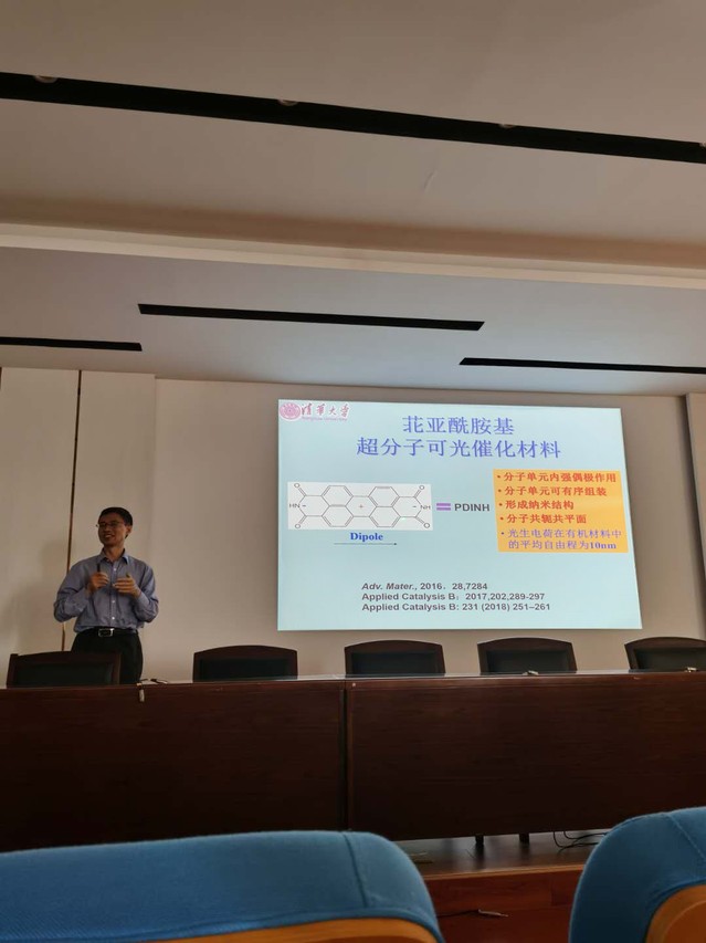 在报告会上,朱永法教授作了题为“全有机可见光催化环境净化及肿瘤治疗研究”的学术报告,他以有机超分子基光催化材料的选择及制备为我们展开介绍。朱永法教授详细介绍了设计合成有机超分子基光催化材料以及研究其光催化机制的科学意义。针对有机超分子基光催化材料的设计机制、实现高效肿瘤治疗等两个方面关键科学问题,该课题组设计和制备了一系列有机超分子基光催化材料,并系统研究了它们的肿瘤治疗性能。报告会后,朱永法教授与参会师生就相关学术问题进行了热烈的讨论。