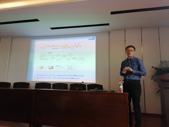 在报告会上,吴教授首先阐述了SO2化学以及有机磺酰类药物分子合成的研究现状;随后,他系统地向大家介绍了该课题组在无金属条件下,利用温和的多组分反应体系定量捕获插入“SO2”结构片段合成药物活性分子的研究进展,详细解释了这些反应的自由基形成机理,以及反应的特色。近年来,吴教授课题组利用所发展的独特反应,建立了不同结构的有机磺酰药物分子的合成体系,改进了几例磺酰药物的合成工艺。
