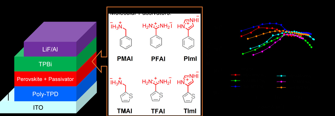 目前,高效率的PeLED都是基于溶液法制备的。但是,溶液法容易在薄膜中引入缺陷,使得非辐射复合增加,进而导致器件效率降低。分子钝化是一种能有效减少缺陷、抑制非辐射复合、增强辐射复合的方法。其中,有机胺盐已经被广泛报道可以用来有效钝化钙钛矿表面和晶界的缺陷,提高器件的效率和稳定性。然而,目前报道的有机铵盐钝化剂主要是一些伯胺类化合物,基于伯胺类钝化剂的器件性能还有待提升,并且钝化剂与钙钛矿之间的相互作用还缺乏深入的理解。因此,为了开发新的高效的分子钝化剂,深入研究分子钝化剂与钙钛矿表面的相互作用机制,我院梁爱辉副教授与美国普渡大学的窦乐添(Letian Dou)教授团队合作设计并合成了一系列含不同末端结构的有机钝化剂,并成功应用于PeLED。其中以苯基咪唑碘(PImI)为钝化剂的基于MAPbI3的PeLED的最大外量子效率达到了15.6%。
