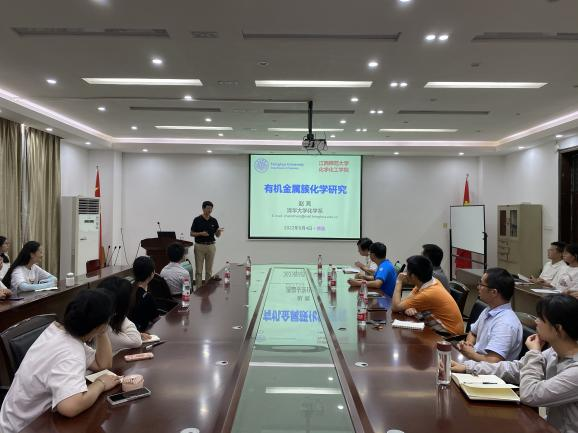 2022年8月4日,清华大学化学系赵亮教授应江西师范大学化学化工学院邀请进行学术报告,报告主题为《有机金属簇化学研究》,报告会由钟声亮教授主持。报告中,赵亮教授阐明了金属、金属簇以及非均相金属催化剂的催化机理的重要意义。同时针对有机金属簇的可控合成(包括核数、构型、金属种类)问题,讲述了基于有机反应中间体的饱和配位稳定策略合成的一系列含有单碳、邻二双碳、相邻C,C,N三中心的多核有机金属簇化合物。在最后提问交流环节,现场气氛热烈,赵亮教授就在场师生所提出的问题进行了深入讨论。