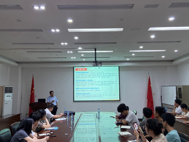2023年6月17日上午,陕西科技大学王传义教授应我院邀请,作了题为《光催化中的缺陷工程与表面化学》的学术报告,报告会由我院卢章辉教授主持。王传义教授向我院师生介绍了光催化的重要应用前景,针对光催化材料缺陷微结构调控和表界面化学,重点介绍了其课题组近年来的相关工作,主要包括缺陷的构建与调控-黑色TiO2,缺陷与等离子体协同-全光谱响应光催化,缺陷微结构诱导的多场增强催化效应-压电光催化,缺陷调控反应路径-光催化产H2O2,缺陷的“锚定”作用-单原子催化,缺陷的“模板”作用及双缺陷协同-光催化固氮等。报告结束后,王教授与师生进行了积极的交流和探讨。
