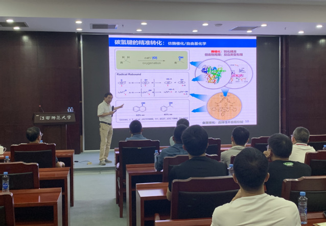 2023年9月28日下午,中国科学院上海有机化学研究所刘国生研究员应邀在知行楼第二报告厅作了题为“碳氢键的不对称催化转化”的学术报告。报告会由学院副院长陶端健教授主持,师生代表60余人聆听了报告。刘国生研究员的报告针对碳氢键活化及官能团化的位点选择性和不对称转化的这一挑战性难题,基于自由基不对称控制角度阐述碳氢键选择性转化,探讨了金属物种如何调控自由基反应的选择性,并由此来影响杂原子自由基的选择性攫氢以及金属对自由基不对称成键反应等过程,从而发展碳氢键的选择性转化新反应。报告会后,刘国生研究员与现场师生进行互动交流,就大家提出的疑问和感兴趣的问题作了详细的回复,现场学术气氛热烈浓厚。