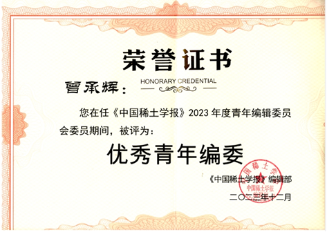 近日,《中国稀土学报》期刊编辑部遴选2023年度优秀青年编委,表彰其在期刊审稿、组稿等方面做出的突出贡献。我院青年教师曾承辉副教授获此荣誉。