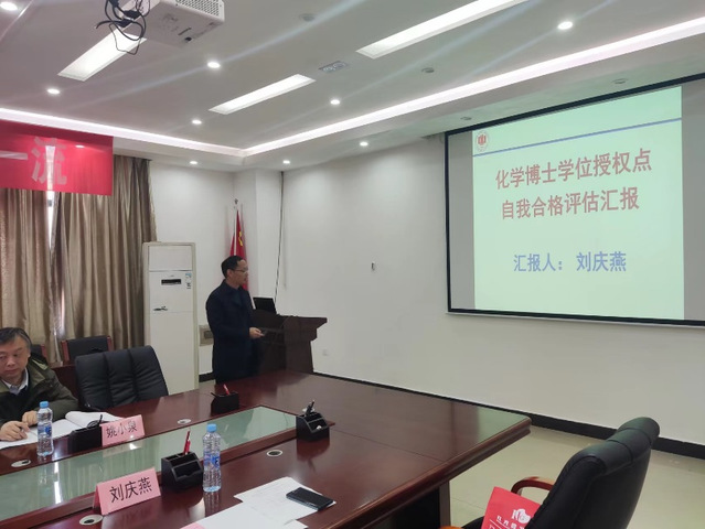 随后,学位点负责人刘庆燕教授简要介绍了学院的基本情况,并从学科方向、师资队伍、教学科研、人才培养、社会服务等方面分别向专家组详细汇报了化学博士学位授权点的建设情况。