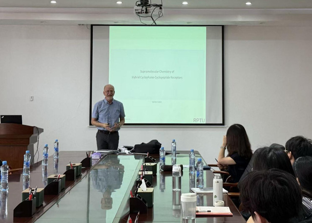 2025年10月14日上午,德国著名有机化学家、凯泽斯劳滕-兰道大学Stefan Kubik教授应邀在方荫楼5510会议室作了题为《Supramolecular Chemistry of Hybrid Cyclophane-Cyclopeptide Receptors》的学术报告。报告由学院副院长胡晓玉教授主持,学院40余名师生代表参加了此次报告会。