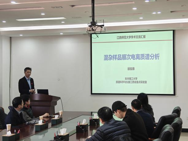 随后,徐加泉教授作了题为《混杂样品顺次电离质谱分析》的学术报告。其研究工作提出了一种顺次电离质谱分析新策略,通过调控能量/试剂与样品作用的选择性,实现了混杂样品中不同理化性质金属组分及有机组分的直接电离;进一步研制出顺次电离质谱分析新装置,实现了试剂/能量与样品作用过程的程序化、精准调控,获得了混杂样品中不同理化性质金属组分及有机组分的分子结构、丰度含量、物理化学关联以及动态变化信息,为解决环境、地质、材料、生命等领域关键问题提供了一种重要研究手段。