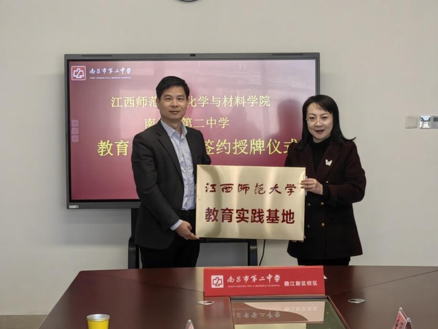 在双方代表的共同见证下,卢章辉副院长与杨颐琴副校长分别代表化学与材料学院和南昌二中赣江新区校区签署了共建教育实践基地合作协议。此次签约标志着双方正式建立长期稳定的合作关系,为后续开展深度协同育人工作奠定了坚实基础。