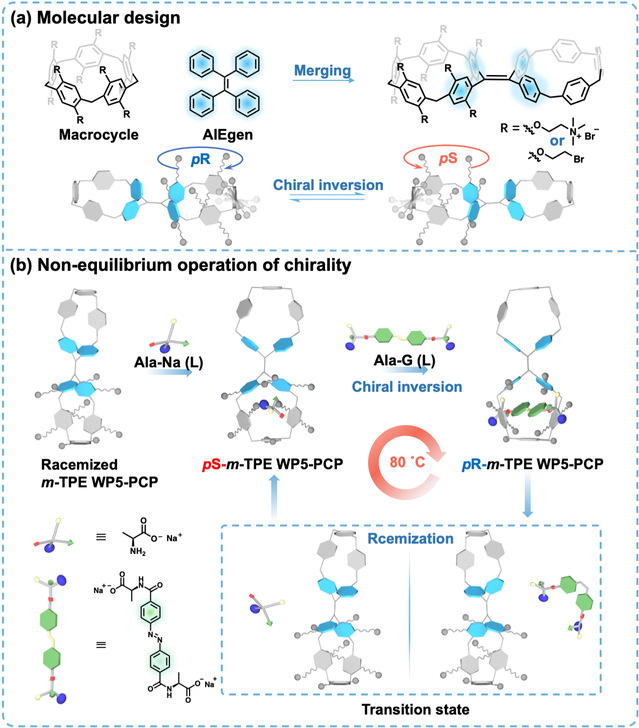 为此,胡晓玉教授团队报道了一种在柱芳烃meso位实现功能化的两亲性二聚柱芳烃的合成方法。该嵌有四苯乙烯(TPE)结构的柱[5]芳烃-[15]对环芳烃偶联物(m-TPE WP5-PCP)具有固有的两亲性,其中[15]对环芳烃部分作为疏水组分,柱[5]芳烃单元则作为亲水部分。这两种不同大环化合物在meso位通过双键直接偶联,在保留各自结构特性的同时,产生了具有新颖自组装行为的正交结构。此外,基于柱芳烃固有的平面手性,研究团队进一步利用该大环和手性客体构建了光驱动体系,以调控组装体的手性,从而实现对所得超分子组装体手性的精确控制。得益于该二聚大环的正交分子识别能力,m-TPE WP5-PCP的平面手性最初是通过将丙氨酸盐穿入大环空腔来诱导产生的。为了实现体系的手性翻转,引入了丙氨酸功能化的偶氮苯衍生物,使光照能够作为外部刺激来触发这个动态过程。在365 nm紫外光照射下,偶氮苯发生从反式到顺式的异构化,同时诱导大环化合物手性状态的外消旋化。这种变化改变了整个体系的化学势,使其偏离热力学平衡状态。停止紫外光照射后,亚稳态的顺式偶氮苯通过热弛豫逐渐恢复到热力学更稳定的反式构型,并使体系恢复平衡,同时大环化合物的手性得以恢复。这一过程同时对层次化形貌进行了调控,实现了螺旋纳米管与球形纳米颗粒之间的适应性转变。该策略不仅推动了超分子手性的动态控制,还为自适应纳米材料的开发提供了多种途径。