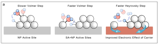 该团队通过构建具有强电子牵引的耦合双活性位点催化模型,成功揭示了其在碱性HER中对Volmer与Heyrovsky步骤的加速机制,为解决长期以来碱性介质中铂基催化剂析氢动力学效率低的难题提供了有效的理论路径和关键实验依据,为超低金属负载的高效电催化剂设计提供新思路。